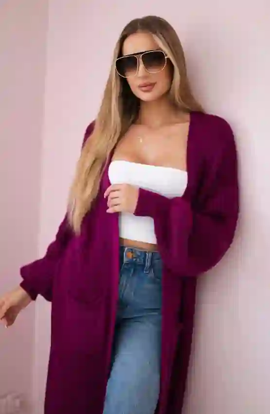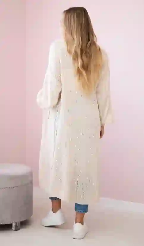 Fason: Długi kardigan o prostym kroju z lekko luźnym dopasowaniem – elegancki, ale niekrępujący ruchów.