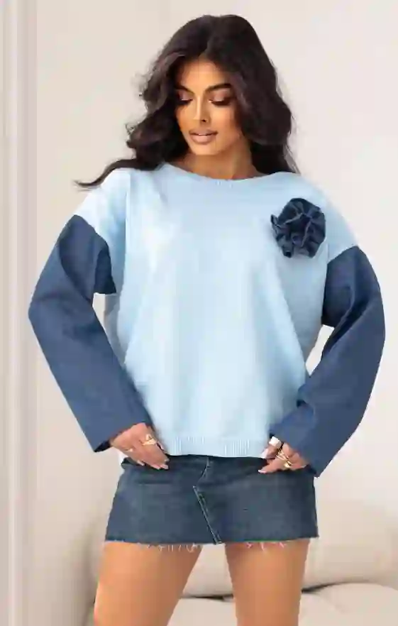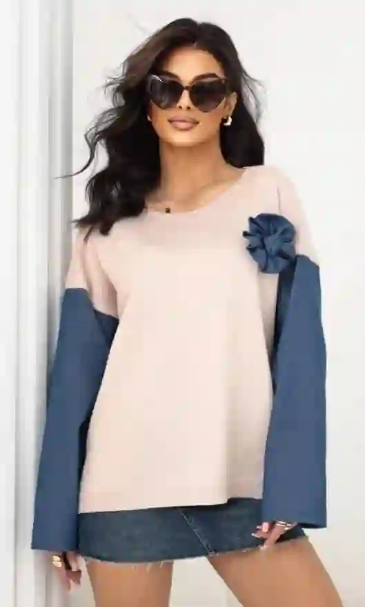 Model o prostym, lekko luźnym kroju, doskonale układa się na sylwetce i zapewnia pełen komfort noszenia przez cały dzień. Charakterystycznym elementem jest kontrastowe wykończenie rękawów oraz subtelna ozdoba w formie materiałowego kwiatu umieszczona przy dekolcie – detal, który dodaje całości kobiecego uroku i wyjątkowego charakteru.