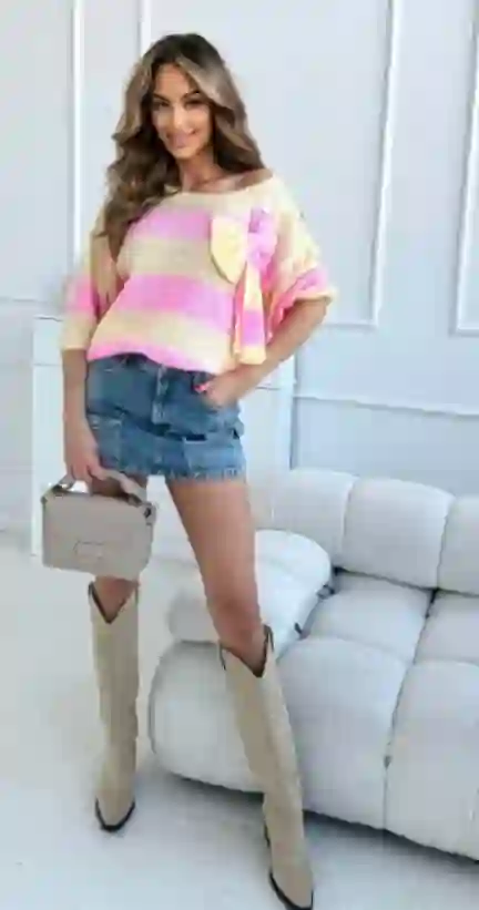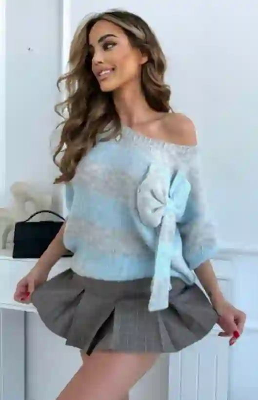 Luźniejszy krój gwarantuje swobodę ruchów, a delikatnie obniżona linia ramion nadaje całości lekkości i nowoczesnego charakteru. Uroku dodaje efektowna kokarda umieszczona na jednym z ramion — to detal, który przyciąga wzrok i sprawia, że stylizacja nabiera wyjątkowego, niepowtarzalnego wyrazu.